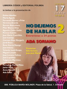Este próximo viernes 17 de junio, a las 19:30 horas, en la Biblioteca Pública Municipal “María Moliner” de Orihuela, se presentará el segundo volumen de No dejemos de hablar, de la poeta y escritora Ada Soriano, que consta esta vez de 24 entrevistas. El libro ha sido publicado por la editorial madrileña Polibea. La presentación del mismo correrá a cargo del editor, Juan José Martín Ramos, y la propia autora.