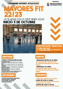 Para todos los programas deportivos será necesario inscribirse a través del 625 168 589. Además, para el de «Mayores fit» también se podrá hacer en el Hogar del Pensionista de 17:00 a 19:30 horas.