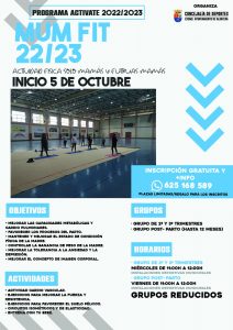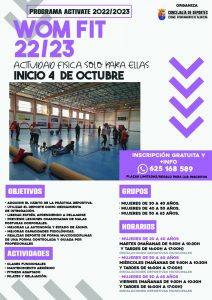 La segunda actividad «Wom-fit» va enfocado a las mujeres de entre 30 y 60 años del municipio y tendrá inicio el 4 de octubre: “Queremos fomentar el deporte y su diversidad y para ello, en esta actividad, habrán diferentes sesiones deportivas, como clases funcionales, mantenimiento aeróbico, fitness adaptado, pilates y relajación. Además, para que la actividad sea más adaptada, habrán tres grupos de diferentes edades: de 30 a 40 años (martes) de 40 a 50 años (miércoles) y de 50 a 60 años (viernes)», continua el edil.