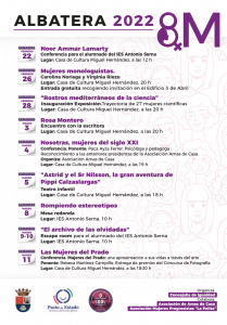La concejalía de Igualdad, a cargo de José Antonio Berná, junto con la Asociación Amas de Casa de Albatera, la Asociación de Mujeres Progresistas La Pleita y el IES Antonio Serna han organizado una serie de actividades comprendi-das entre el 22 de febrero y el 10 de marzo con motivo del Día Internacional de la Mujer, el 8M.