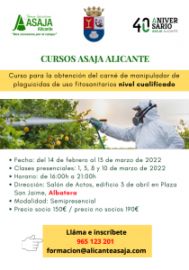 El coste del curso es de 190 euros, excepto para socios de ASAJA que es de 150 euros. Para realizar este curso es necesario la inscripción previa en el 965 123 201 o en formacion@alicanteasaja.com