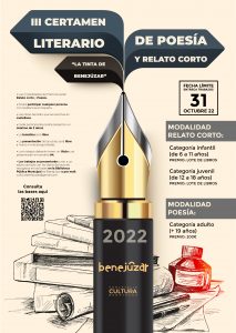 A partir de esta semana se pone en marcha la tercera edición del Certamen Literario de Poesía y Relato Corto ‘La tinta de Benejúzar’. La entrega de los trabajos se puede hacer hasta el 31 de octubre. Las actividades de este mes de septiembre acaban con una presentación del libro ‘EOS’ de Inma Fuentes, que se llevará a cabo este miércoles en la biblioteca municipal.