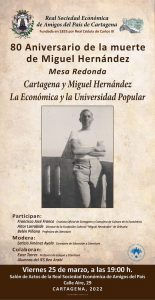 Este próximo viernes día 25 de marzo, a partir de las 19:00 horas, la Real Sociedad Económica de Amigos del País de Cartagena rendirá en su Salón de Actos (calle del Aire, 29) un homenaje a Miguel Hernández por el 80 aniversario de su muerte.