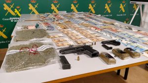 Durante el registro se intervinieron más de medio kilo de sustancias estupefacientes, entre hachís y marihuana, más de 3.000 euros en efectivo, así como dos armas cortas, procediéndose a la detención de los tres integrantes del grupo.A los detenidos, tres hombres, de 21, 27 y 30 años, se les imputan los delitos de pertenencia a grupo criminal, contra la salud pública, tenencia ilícita de armas y un delito de robo con violencia, siendo puestos a disposición del Juzgado de Instrucción de Torrevieja.