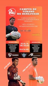 Avanzan a buen ritmo las inscripciones para el campus de verano que tendrá lugar del 10 al 14 de julio en Benejúzar, organizado por los porteros Aitor Arias, del Orihuela CF, y Pablo Martínez, del Atlético Catral, en colaboración con la marca RG.