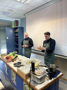La primera ponencia fue a cargo de Gerardo Martínez, nutricionista bajo el título “Hábitos alimentarios para una vida saludable”. Posteriormente un almuerzo y a continuación “a ponerse el delantal” de la mano de Miguel Montesinos chef del Restaurante “La Mirada” (la Zenia. Orihuela Costa) con 18 años de experiencia y formado con Martin Berasategui, Kiko Moya, Alberto Ferruz y Susi. Una demostración culinaria que deleitó a todos los asistentes con sus presentaciones sobre la alcachofa. De entre ellas hay que destacar un embutido de alcachofa que encantó a todos.
