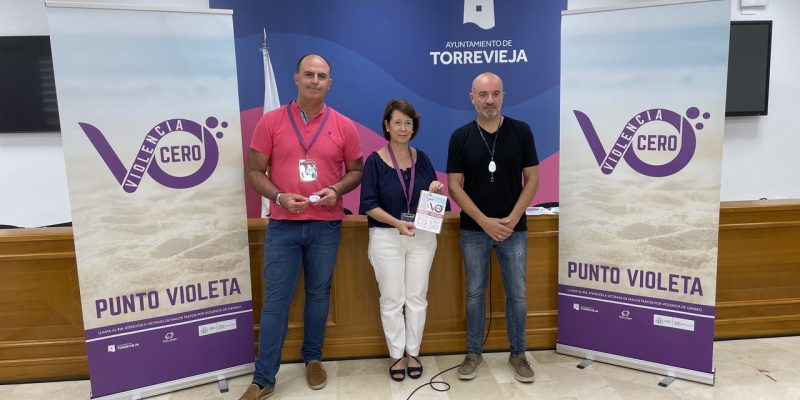 La concejal de Igualdad y Mujer del Ayuntamiento de Torrevieja, Inmaculada Montesinos, acompañada por el concejal de Bienestar Social, Óscar Urtasun, y el edil de Cultura, Antonio Quesada, han presentado en la mañana de hoy el Punto Violeta para la atención prioritaria en caso de violencia de carácter sexual o sexista o cualquier tipo de violencia contra las mujeres, que se instalará en todos los conciertos que se van a realizar en el Festival Brilla Torrevieja. Un Punto Violeta que se ha podido poner en marcha con la colaboración del cuerpo de Protección Civil y ha sido facilitado por el equipo organizador de Brilla Torrevieja.