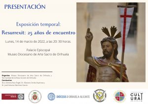 El próximo lunes 14 de marzo, a las 20:30 horas, se presentará e inaugurará en el Museo Diocesano de Arte Sacro, en Orihuela, la exposición temporal “RESURREXIT: 25 años de encuentro”. Conmemora el 25 aniversario de la celebración del encuentro de Domingo de Resurrección en Orihuela entre las imágenes del Cristo Resucitado y la Virgen Dolorosa de la Hermandad de la Resurrección de Orihuela.