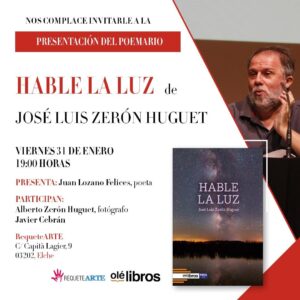 El próximo viernes día 31 de enero de 2025 se presentará, a partir de las 19:00 horas, en la sala Requetearte de Elche, el poemario ‘Hable la luz’ del escritor y poeta oriolano José Luis Zerón Huguet.