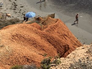 La portavoz socialista, Carolina Gracia, ha hecho pública esta mañana en la Playa de Aguamarina, la denuncia que recibían en su grupo por parte de algunos bañistas que vieron como el domingo se desalojaba a una parte de la gente que se encontraba en la playa. “La gente se sorprendía al desconocer los motivos del desalojo, que respondía básicamente al peligro que conlleva situarse cerca de la zona del acantilado que se desprendió en octubre de 2020 y que actualmente sigue sin contar con un vallado fijo y señalización suficiente que alerte del riesgo”.