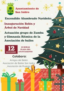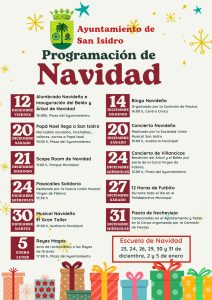 – SÁBADO 20 DE DICIEMBRE: Papá Noel llega a San Isidro e inauguración del Mercadillo Navideño con hinchables, talleres y cartas a Papá Noel, a las 10:30 horas en la Plaza del Ayuntamiento. Por la tarde, a las 19:00 horas, Concierto Navideño realizado por la Sociedad Unión Musical San Isidro en el Auditorio Municipal.