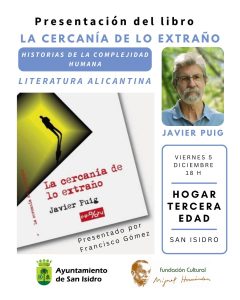 El Hogar de la Tercera Edad de San Isidro acoge este viernes 5 de diciembre, a partir de las 18:00 horas, la presentación del libro “La Cercanía de lo Extraño” del escritor barcelonés residente en Orihuela, Javier Puig.