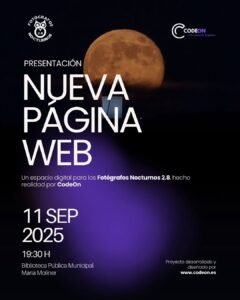La Asosciación de Fotógramos Nocturnos 2.8 de Orihuela presentará el 11 de septiembre su nueva página web a las 19:30 horas en la biblioteca municipal María Moliner. Se trata de un espacio digital completamente nuevo que servirá como punto de encuentro para los amantes de la fotografía nocturna.