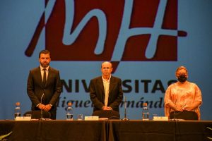 Se refirió después a los ejes centrales sobre los que se asienta el modelo formativo de la Universidad Miguel Hernández: el conocimiento actualizado propio y específico de una titulación; los idiomas (en especial el inglés cuya comunidad universitaria lo puede cursar de forma gratuita y lograr la certificación hasta un nivel C1); la informática (todo el estudiantado puede cursar inteligencia artificial de forma gratuita y transversal para poder entender y utilizar este lenguaje en su campo de actividad); y la iniciativa emprendedora y la innovación para formar personas que aporten y generen valor económico y social en el ámbito donde se desarrollen.