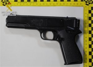 El Equipo Territorial de Policía Judicial de la Guardia Civil de Almoradí, que instruye las diligencias por estos hechos, realizó rápidamente unas primeras investigaciones, hallando durante el registro en el domicilio del sospechoso escondida en un mueble, la pistola con la que habían sido cometidos los atracos: un arma corta de aire comprimido, de balines.