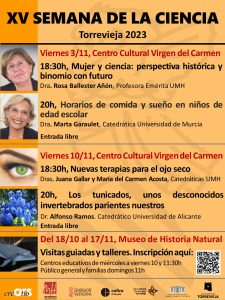 Cuatro charlas de divulgación científica impartidas por profesoras e investigadoras seleccionadas de la Universidad Miguel Hernández, la Universidad de Alicante y la Universidad de Murcia, y visitas guiadas y talleres en el Museo de Historia Natural de Torrevieja conforman la programación abierta al público este año en la XV edición de la Semana de la Ciencia organizada por Ars Creatio en colaboración con la Concejalía de Cultura del Ayuntamiento de Torrevieja. Como siempre, las charlas serán realizadas en el Centro Cultural Virgen del Carmen con entrada libre hasta completar el aforo.
