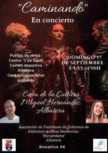 “Por otro lado, el domingo 17 de septiembre a las 18:00 horas en la Casa de Cultura Miguel Hernández, habrá otro concierto “Caminando”, de un grupo de actores amateur, quienes participan con muchas asociaciones sin ánimo de lucro con un carácter benéfico. Nos harán una mezcla de teatro, música y poesía. Os aseguro que nos van a emocionar mucho”, ha continuado la presidenta de la Asociación.