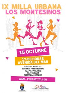 El próximo sábado 15 de octubre se celebrará en el municipio de Los Montesinos la novena edición de la milla urbana de Los Montesinos, realizándose nuevamente en la Avenida del mar a partir de las 17:00 horas, siendo un circuito circular, donde los/as participantes realizaran varias vueltas según su categoría y edad.