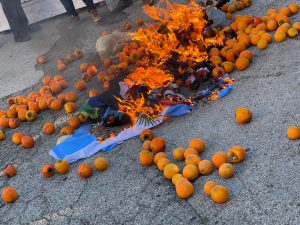 El acto de protesta ha consistido en una marcha de personas y vehículos (tanto turismos y furgonetas como tractores y maquinaria de uso agrícola) que ha discurrido desde las poblaciones de Favara (Ribera Baixa) hasta Tavernes de la Valldigna (La Safor). En la primera localidad se ha realizado un esmorzar popular y antes de iniciar el recorrido se ha producido la quema de naranjas y caquis, de un muñeco con la imagen del director de ENESA, José Miguel Pérez, que pretende “cargarse” el actual seguro de cítricos y también de banderas de países terceros que ejercen competencia desleal a nuestras producciones, nos introducen plagas y no cumplen con los estándares europeos de producción. Tras circular por la N-332 hasta Tavernes de la Valldigna, en un recorrido de unos 9 kilómetros, en la plaça de l’Ajuntament de esta localidad se han llevado a cabo los parlamentos y se han esparcido de nuevo caquis y naranjas.