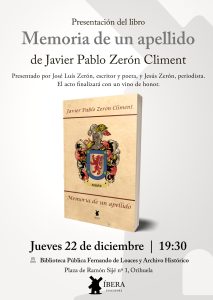 Este próximo jueves día 22 de diciembre de 2022 se presentará, a partir de las 19:30 horas, en la Biblioteca Pública Fernando de Loaces y Archivo Histórico de Orihuela, el libro ‘Memoria de un apellido’ del autor oriolano Javier Pablo Zerón Climent, editado por Íbera Ediciones.