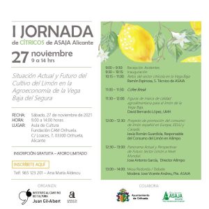 La situación actual y futura del cultivo del limón en la agroeconomía de la Vega Baja del Segura será la protagonista en la I Jornada de Cítricos que se celebra este sábado en Orihuela, organizada por el Instituto Juan Gil-Albert de la Diputación de Alicante, con la colaboración ASAJA-Alicante, y el Ayuntamiento de Orihuela.