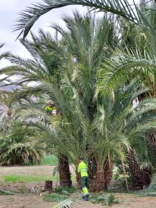 La Concejalía de Medio Ambiente del Ayuntamiento de Orihuela ha iniciado los trabajos de escarda y retirada de hojas de las palmeras municipales del BIC del Palmeral, además de las descarga de peso para evitar que se curven. Tras las labores de poda se realizará un tratamiento fitosanitario contra las plagas.