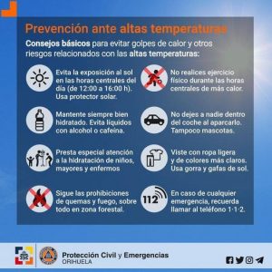 Se prevé que las temperaturas máximas diurnas superen los 40º y las nocturnas no bajen de 25º , “lo que se va a traducir en noches cálidas y tropicales que van a hacer casi imposible conciliar el sueño. Desde la Concejalía de Protección Civil y Emergencias vamos a estar muy pendientes también de nuestras masas forestales, Sierra de Orihuela, Sierra de Hurchillo y Dehesa de Campoamor, para que no se produzcan incendios”, ha comentado Valverde.