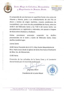 Las procesiones programadas para este Miércoles Santo tendrán lugar mañana Jueves Santo con el siguiente horario: