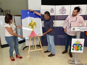El concejal de Festividades, Antonio Sánchez junto con la concejala de Protocolo, María García y Pepe Ruiz, Síndico Portador de la Gloriosa Enseña del Oriol 2022 ha presentado la tarjeta de invitación a la recepción del Síndico que tendrá lugar en la noche del 16 al 17 de julio, en el claustro de la Biblioteca Municipal María Moliner, tras el acto de Exposición Pública de la Enseña.