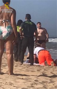 Al llegar a la playa, los dos agentes corrieron hasta el tumulto. Uno de ellos, se arrodilló junto al cuerpo de una mujer que se encontraba en la orilla e inició las maniobras de reanimación cardiopulmonar logrando que ésta expulsara el agua que tenía en las vías respiratorias y consiguiendo mantenerla con vida hasta la llegada de los servicios sanitarios. El otro agente de la Guardia Civil, sin pensarlo, se adentró en el agua para alcanzar al hombre que, aunque agarrado a un flotador salvavidas que le habían lanzado, se encontraba exhausto, con la cabeza sumergida, y arrastrado por la corriente que le impedía salir. Lo agarró fuertemente y tras varios intentos logró sacarlo hasta la orilla. Aunque aturdido, se encontraba consciente.