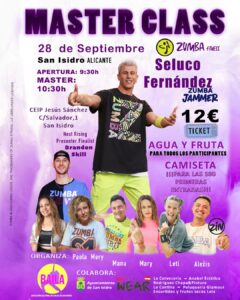 La Asociación Cultural de Bailes de San Isidro, en colaboración con el Ayuntamiento de la localidad, organiza una Máster Class de zumba fitness que tendrá lugar el domingo 28 de septiembre en el patio del CEIP Jesús Sánchez, con la participación de 8 conocidos instructores de toda la provincia de Alicante.