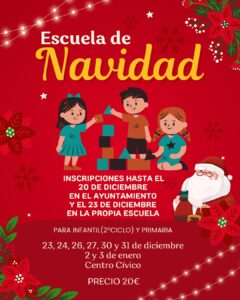 Por otro lado, este lunes 23 de diciembre comenzará la Escuela de Navidad, otra iniciativa municipal que ha sido diseñada para la conciliación de los padres que tienen que trabajar. Con una duración de 8 días (23, 24, 26, 27, 30 y 31 de diciembre y 2 y 3 de enero), esta escuela se desarrollará en el Centro Cívico con una inscripción previa de sus participantes de 20 euros.