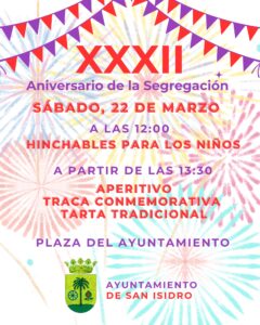 San Isidro celebra el 32 aniversario de su segregación del municipio de Albatera y para eso, el Ayuntamiento ha preparado una jornada festiva especial para este sábado 22 de marzo, en la que se ha programado hinchables para los niños a partir de las 12:00 horas y, a partir de las 13:30 horas, el disfrute de un aperitivo y una tarta tradicional, así como el lanzamiento de una traca conmemorativa a las 15:15 horas, momento en el que se produjo oficialmente la segregación en el año 1993. Todo ello tendrá lugar en la Plaza del Ayuntamiento.