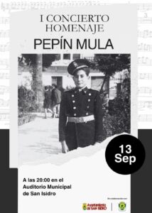 Este viernes 13 de septiembre tendrá lugar en el Auditorio Municipal de San Isidro, a partir de las 20:00 horas y con entrada libre, un concierto-homenaje al músico local Pepín Mula, recientemente fallecido, que ejerció la profesión en los años 40 en la banda de música de Orihuela y que ha tenido una gran influencia musical en la localidad y especialmente en su familia.