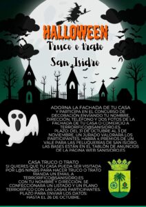 Una hora después, a las 18:00 horas, tendrá lugar un concurso titulado “Truco o Trato” en el que participarán los vecinos del pueblo decorando las fachadas de sus casas y comercios con motivos de terror. Los interesados en participar deben enviar su nombre, dirección, teléfono y dos fotos de la fachada decorada, a terrorifico@sanisidro.es, del 31 de octubre al 3 de noviembre.