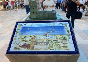 En el grabado del mosaico el autor simboliza en los laterales los productos típicos de la zona, así como las actividades industriales del momento. Como detalles, el embarcadero antiguo a la izquierda y el lentisco a la derecha.