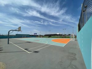 La concejal de Deportes del Ayuntamiento de Torrevieja, Diana Box Alonso, informa de los trabajos que se están realizando para la mejora y acondicionamiento de las instalaciones de la Ciudad Deportiva. Se trata de la pista exterior denominadamente popularmente “La Mosquitera”, en la cual se ha llevado a cabo una reparación integral que ha consistido en una nueva pavimentación, ampliación de muros parabalones de los fondos, reparación de barandillas de las gradas y las mallas metálicas de las partes traseras, renovación de canastas de baloncesto y porterías de balonmano/fútbol sala y nuevo pintado de las gradas y del marcaje de pista.